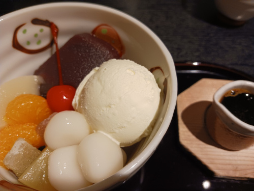 注文したのは人気メニューの「白玉クリームあんみつ」。黒蜜か白蜜が選べ、今回は黒蜜にしました(白蜜?知りませんでした)。